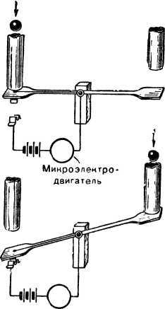 Когда все будет подготовлено, провода присоединены к своим местам, можно приступить к испытанию нашего устройства. Коромысло должно стоять в исходном положении горизонтально. Бросьте в трубку, которая установлена над контактным концом коромысла, шарик. Ударившись в лопаточку, он двинет конец коромысла вниз, контакт замкнется и будет удерживаться благодаря пружинящим изгибам нижнего контакта, имеющего, как уже говорилось, форму М. Микродвигатель или лампочка включится. Теперь бросьте шарик в другую трубку. Контакты должны быть так отрегулированы, чтобы была и надежная электрическая цепь и чтобы они легко размыкались при ударе шарика о вторую лопатку. Шарик упал, коромысло повернулось, контакты разомкнулись, двигатель остановился, а если была включена лампочка, то она погаснет.