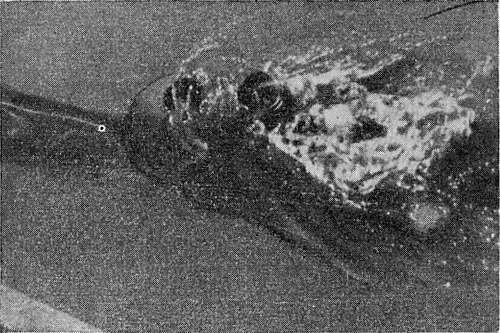 Наконец работа закончена; начинает отсчитывать секунды часовой механизм взрывателя, который сработает через два с половиной часа. Помощник возвращается на свое место. Три толчка в спину — все сделано. Включаете мотор, уходите из-под корабля и плавно поднимаетесь наверх. Теперь можно подумать и о своем спасении».