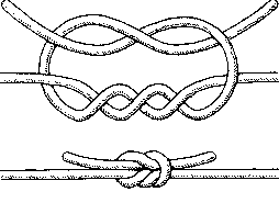 Хирургический узел(рис. 27). Как уже рассказывалось в начале этой книги, узлы издавна применялись для различных целей не только в морском деле, но и в медицине. Ими до сих пор пользуются хирурги для завязывания нитей лигатур при остановке кровотечения и для сшивания тканей и кожи. В наши дни медицина еще не отказалась от применения узлов, и врачи умело их используют. При полостных операциях хирургам приходится накладывать швы из кетгута (особого материала, получаемого из слизистого слоя кишок барана или овцы), который через 3-4 недели рассасывается. При завязывании кетгут скользит, и, делая на нем узлы, хирурги пользуются особыми зажимами.