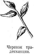 Отрезанная веточка традесканции с двумя — тремя листьями, воткнутая во влажную землю или песок, даёт через три-четыре дня корешки.
