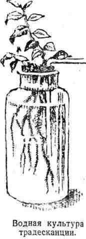 Опытами с водными культурами традесканции и других растений вы можете положить начало организации на окне ботанической лаборатории или уголка имени К. А. Тимирязева.