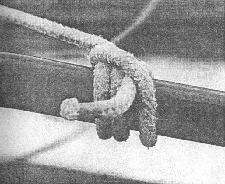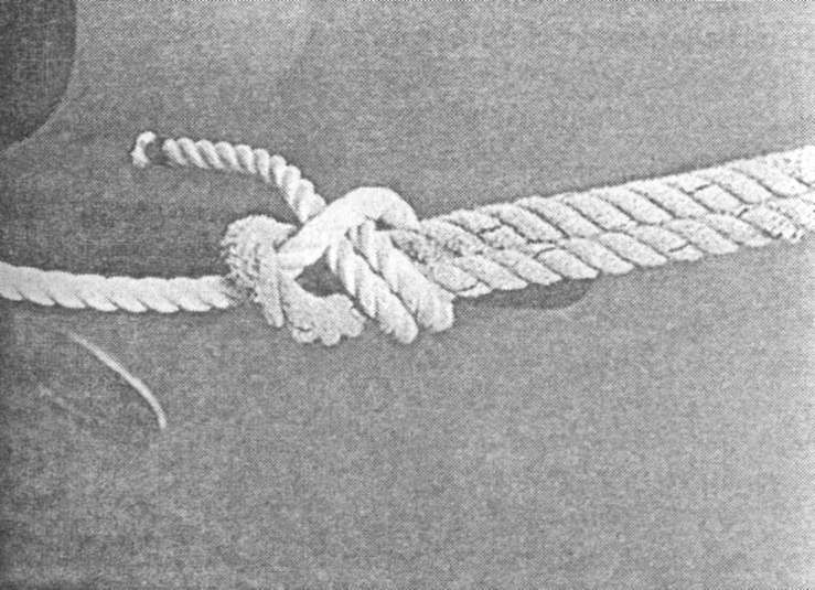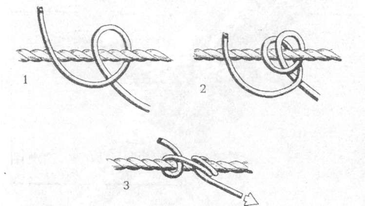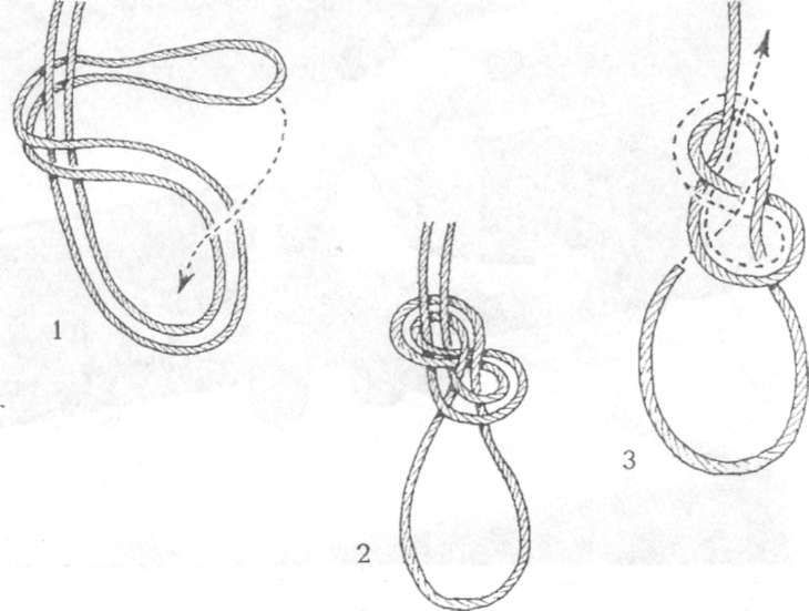 Тогда, когда постоянной петельки не существует, делают бухту на конце одной из веревок (обычно той, что толще), а конец другой веревки проходит через нее, огибает сзади обе основные части и проходит внутрь петельки. Рисунок поможет вам разобраться, но будьте осторожны при окончании работы с рабочими концами веревок. Завязывайте их потуже.
