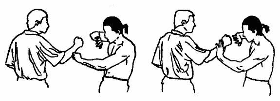 В та время как верхняя рука, согнутая в локте, страхует лицо, нижняя, распрямленная рука прикрывает живот и пах. Локти сведены друг к другу напротив солнечного сплетения и не покидают этого положения, какая бы техника ни выполнялась. Эта позиция — одно из основных в агрессивном стиле Да-цзе-шу чаньтун, славящемся неотразимыми расклинивающими атаками. Она также сплошь и рядом встречается в каратэ — но правильный способ ее использования там во многом утерян.