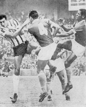И двоих мало, чтобы сдержать Манэ… Матч сборных Бразилии и Англии на чемпионате мира 1962 года в Чили.