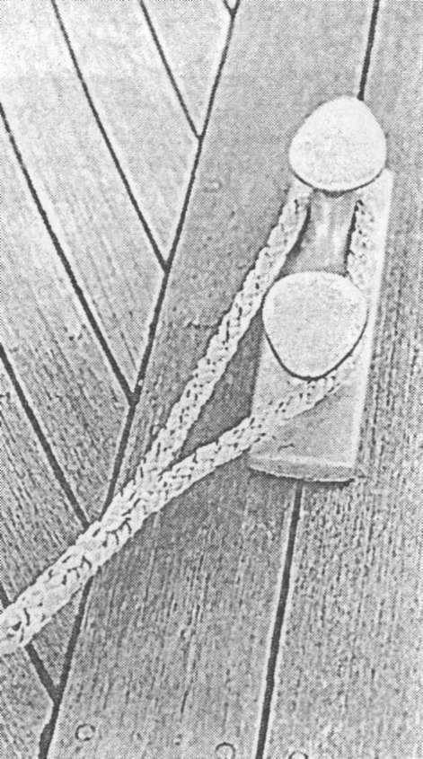 Этот вид соединения не такой крепкий, как огон, но из плетеной веревки почти невозможно сделать прочной петли, так что он вполне подойдет. Сделайте ушко нужной вам формы. Хвостик, должен быть не менее 75 мм, если считать от горла. Используя нить, пропитанную воском, прошейте веревку от горла до конца хвостика. Отрежьте нить, и пройдитесь молотком по веревке от горла и до конца хвостика, скрепляя, таким образом, эти две части. Затем обшейте эту часть веревки нитью и снова бейте ее молотком после нескольких оборотов. На половине обшивки проткните веревку, чтобы заблокировать обшивку. Продолжите до конца и завершите работу, сделав несколько стежков на основной части веревки.