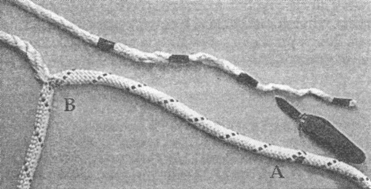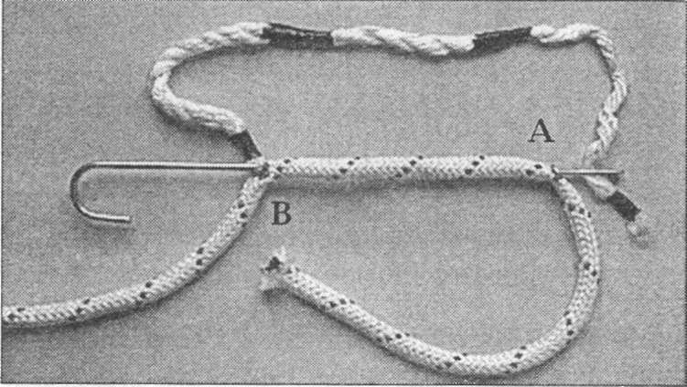 Сначала на расстоянии 3 метра от конца веревки сделайте тугой Простой узел или Восьмерку, дабы скрепить сердечник и оболочку вместе. Затем с помощью маркера или фломастера сделайте метку «А» на расстоянии, равном длине иглы. Сделайте петлю нужного вам размера и поставьте метку «В» в районе горла петли, прямо напротив отметки «А». С помощью иглы вскройте оболочку и пометьте показавшуюся часть сердечника как «С». Вытяните сердечник наружу так, чтобы поверх не было оболочки (которую нужно временно отложить),