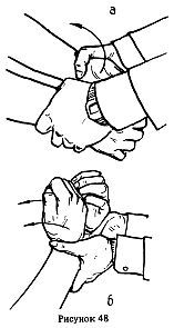 На рис. 44а, б показаны два варианта захвата за кисть и одинаковый способ освобождения от этих захватов. Стрелки указывают направление вращения (движения) руки (кисти). Кисть захваченной руки при этом сжимается в кулак, мускулы напрягаются. Движения должны быть резкими и энергичными.