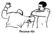 Прижимая кисть захваченной руки противника правым плечом к себе, резким движением руку вверх и поворотом корпуса влево, травмировать локтевой сустав (рис. 49г).