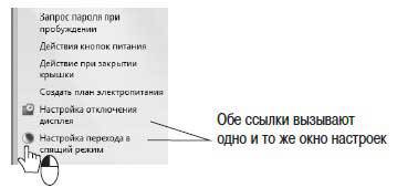 Чтобы изменить установленные по умолчанию параметры энергосбережения, щелкните в левой части окна на ссылке Настройка отключения дисплея или Настройка перехода в спящий режим.