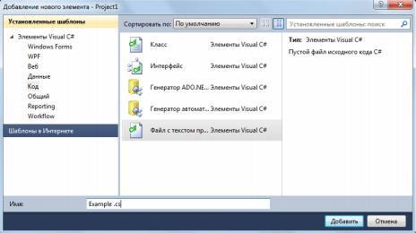 Выберите команду Создать элемент (New Item), чтобы открыть диалоговое окно Добавление нового элемента (Add New Item). Выберите сначала элемент Код (Code) из списка Установленные шаблоны, а затем шаблон Файл с текстом программы (Code File) и измените имя файла на Example.cs, как показано на рисунке.