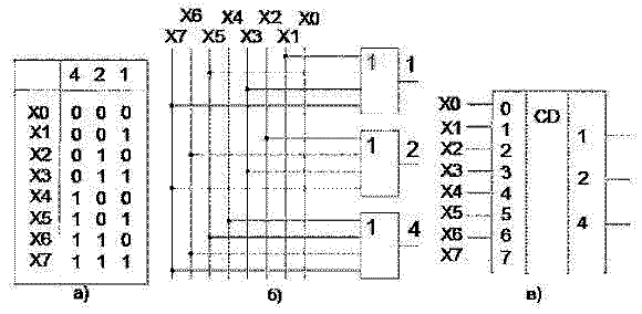 В качестве примера разработаем схему 3-разрядного шифратора. Вначале следует построить таблицу кодов (таблицу истинности), в которой код номера сигнала представим, например, двоичным кодом (Рисунок 27,а). Схема, реализованная на элементах ИЛИ, приведена на рисунке 27,б.