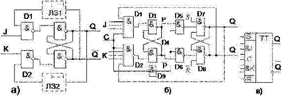 Рисунок 51 JK-триггеры: а) асинхронные; б) тактируемые фронтом.