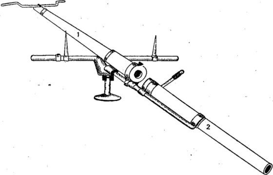 Рис. 6. Общий вид пушки без отката; 1) ствол для боевого снаряда; 2) ствол для фальшивого снаряда. Пушка открыта для заряжания.
