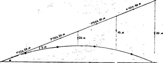 Вы видите, что он описывает в воздухе дугу, которую, как и всякую линию движения тела, называют «траекторией». Если бы не было силы тяжести, т. е. камень не притягивался бы к земле, он полетел бы прямо по направлению броска. Но так как камень все время притягивается к земле, он не только летит вперед, но одновременно падает. Скорость его падения всегда одинакова и не зависит ни от уменья бросать, ни от веса камня. В первую секунду камень, падая, опустится вниз на 5 метров [7], во вторую секунду еще на 15 метров, в третью еще на 25 м и т. д. Значит, за первую секунду полета камень «упадет» на 5 метров, за вторую секунду на 20 метров (5+15), за третью — на 45 метров (20 + 25) и т. д. (см. рис. 8). Вот теперь и сравним, как далеко упадут камни, брошенные с разной силой и под разными углами к горизонту. Если сила броска будет больше, то, значит, и скорость, с какой он будет двигаться, также окажется больше. Влияние воздуха на летящий камень мы пока в расчет не будем принимать. Из. рисунков 8 и 9 ясно видно, что быстрее летящий камень, пролетая каждую секунду большее расстояние, упадет дальше, чем брошенный под тем же углом, но с меньшей скоростью.