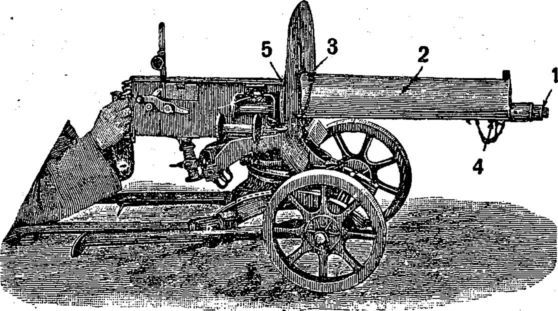 Рис. 22. Пулемет системы Максима: 1) ствол; 2) кожух; 3) отверстие для доливки воды; 4) отверстия для выпуска воды; 5) отверстие для выхода пара (на рисунке не видно).