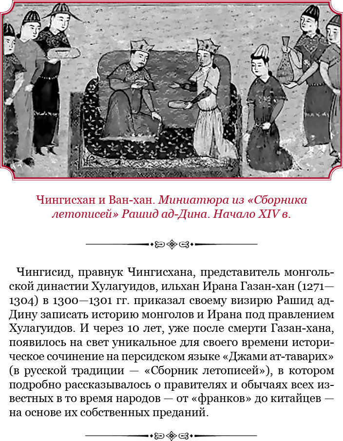 И откочевал Тэмужин от речушки Сэнгур, пришел и сел в местности Бурги эрэг, что в верховьях Керулена. И взял тогда он черного соболя доху, подаренную ему тещею Чотан, и вместе с братьями Хасаром и Бэлгудэем отправился к хэрэйдского народа владыке Ван-хану [88] [89]. Прежде предводитель племени Хэрэйд, Ван-хан был андой-побратимом их отца, Есухэй-хана [90].