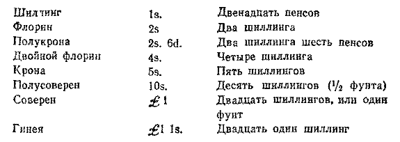 Некоторые из головоломок Г. Э. Дьюдени основаны на знакомстве с британскими монетами, которые могут быть не известны читателю. Основной денежной единицей в Великобритании является фунт стерлингов, который содержит 20 шиллингов; [2] шиллинг в свою очередь содержит 12 пенсов (пенни). Символом фунта служит знак £, который помещается перед числом, выражающим денежную сумму в фунтах. Символами шиллинга и пенса являются соответственно знаки s. и d., которые помещаются после числа. Иногда эти символы опускаются. Обычно британские цены записываются одним из следующих способов: