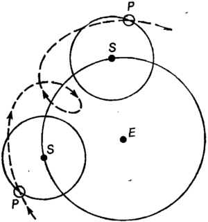 Основная схема того, что теперь принято называть птолемеевой системой мира,вошла в греческую астрономию в период между работами Евдокса и Аполлония. Согласно этой схеме, планета Pдвижется с постоянной скоростью по окружности с центром S,в то время как центр Sв свою очередь движется по окружности, центр которой совпадает с Землей E(рис. 1.5). Окружность, по которой движется точка S,называется деферентом,окружность, которую описывает планета P, — эпициклом.Точка Sдля некоторых планет совпадает с Солнцем, а в остальных случаях это просто математическая точка. Направления, в которых движутся точки Pи S,могут как совпадать, так и быть противоположными. Например, в случае Солнца и Луны точки Sи Pдвижутся по окружностям в противоположные стороны.