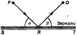 Не меньший интерес, чем астрономия и механика, вызвала оптика. Основы этой науки также были заложены греками. Почти все греческие философы, начиная с пифагорейцев, строили умозрительные заключения о природе света, зрения и цвета, но нас интересуют математические достижения в этой области. Первым было априорное утверждение Эмпедокла (около 490 г. до н.э.) из Агригента — города на острове Сицилия — о том, что свет распространяется с конечной скоростью. Хронологически первыми систематическими исследованиями света, сохранившимися до нашего времени, стали сочинения Евклида «Оптика» и «Катоптрика» {12}. В «Оптике» Евклид рассматривает проблемы зрения и использования зрения для определения размеров различных предметов. В «Катоптрике» (теории зеркал) показано, как ведут себя лучи света при отражении от плоских, выпуклых и вогнутых зеркал и как ход лучей сказывается на том, что мы видим. Как и «Оптика», «Катоптрика» начинается с определений, которые в действительности являются постулатами. Теорема I (аксиома в современных учебниках и монографиях), играющая основополагающую роль в геометрической оптике известна как закон отражения. Она утверждает, что угол αобразуемый с поверхностью зеркала лучом света, падающим на зеркало из точки P,равен углу, образуемому с поверхностью зеркала отраженным лучом (рис. 1.6). Евклид также установил закон падения для луча, падающего на выпуклое и вогнутое зеркала: в точке касания Евклид заменил зеркало касательной плоскостью R(рис 1.7) «Оптика» и «Катоптрика» — сочинения математические не только по содержанию, но и по своей структуре. Основное место в них, как и в «Началах» Евклида, отводится определениям, аксиомам и теоремам.