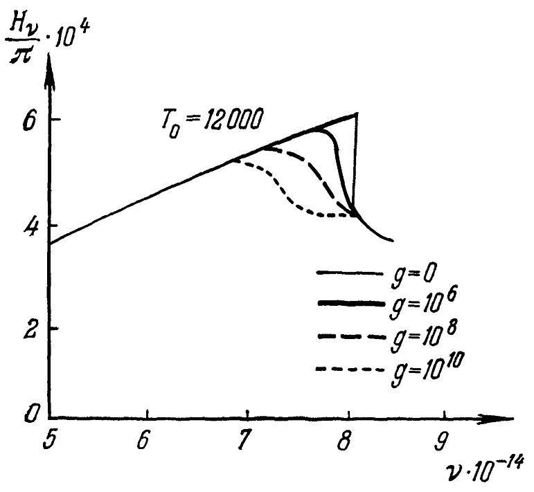 На рис. 9 представлен теоретический спектр звезды с поверхностной температурой 12 000 K вблизи предела серии Бальмера. Из рисунка видно, как усиливается размывание скачка с увеличением ускорения силы тяжести в фотосфере. При больших значениях 𝑔 скачки практически отсутствуют. Наблюдаемые спектры белых карликов как раз и обладают такой особенностью.