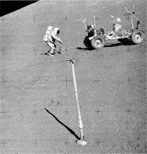 Сернан позже жалел, что не успел написать на покрытом пылью выступе камня имя своей дочери Трейси [9], но нужно было успеть взять керн и грабельный образец. И Джин лихо запрыгал со склона, не рассчитал толчок, сместил центр тяжести вправо и начал медленно театрально падать. На экране это падение выглядело страшнее, чем было на самом деле, поскольку слой пыли оказался толстым и мягким и из него не торчали камни. Все, кто был в ЦУПе, вспоминали этот эпизод с замиранием сердца и через 30 лет, а Сернан забыл его уже через минуту.