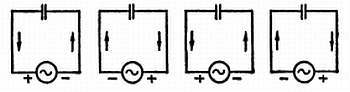 Рис. 29. Движение электронов в цепи, соединяющей конденсатор с источником переменного напряжения. На рисунке показаны четыре последовательных полупериода.