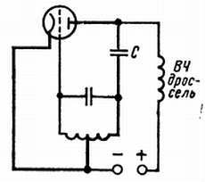 Здесь анодный ток разветвляется на два направления: переменная составляющая через конденсатор С подводится к колебательному контуру, а постоянная составляющая проходит к положительному полюсу анодного напряжения через ВЧ дроссель. Так называют катушку, индуктивное сопротивление которой препятствует прохождению токов ВЧ. По пути к катоду лампы переменная составляющая анодного тока проходит по части катушки колебательного контура; катушка снабжена специальным выводом. Переменная составляющая наводит в контуре напряжение, достаточное для генерирования колебаний.