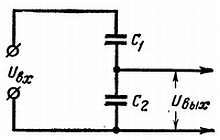 Рис. 7. В тех случаях, когда приходится иметь дело только с переменными напряжениями, делитель напряжения можно сделать на двух конденсаторах.