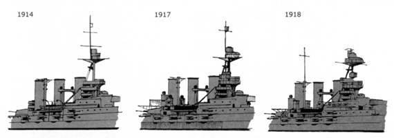 В 1917 г. прожекторные башенки установили вокруг третьей дымовой трубы и увеличили носовой пост управления. Позже установка дальномера на марсе заставила брам-стеньгу мачты установить на опору подъемного крана, а в 1918 г. наверху башен «О» и «В» оборудовали взлетные площадки для бипланов «Сопвич».