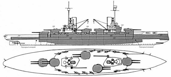 «Остфрисланд» был увеличенным «Нассау» с бортовым залпом из восьми 12-дм и семи 150-мм орудий. «Кайзер» немцы спроектировали по образцу нашего «Нептуна» с эшелонированно расположенными башнями в средней части корабля и возвышенными кормовыми башнями, дающими бортовой залп из десяти 11-дм и шести 150-мм орудий. «Мольтке» и «Гебен» были увеличенными кораблями типа «Фон дер Танн» с возвышенными кормовыми башнями и бортовым залпом из десяти 11-дм и шести 150-мм орудий, и имели 279-мм броневой пояс и 254-мм броневую защиту барбетов и башен. На мерной миле во время 6-часового пробега при форсированной тяге главных механизмов «Мольтке» развил скорость 28,4 уз при мощности 85 782 л.с. и 27,25 уз при мощности 76 795 л.с.