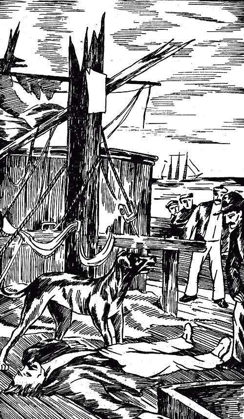 Действительно, среди палубы лежало тело молодого человека, над которым стояла, как бы охраняя его, великолепная серая борзая. Громадные крысы смело бегали по палубе, по сломанным реям, исчезали в люках и снова появлялись целыми стаями.