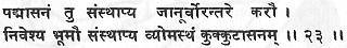 Сядьте, поместив левую ступню позади левой ягодицы, а большой палец этой ступни — под ягодицу, как в ваджрасане.