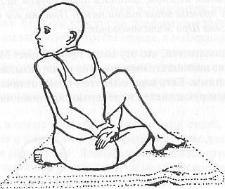 Правую ступню поместите рядом с левой ягодицей. Левая нога должна быть сверху; ее колено поднято вверх, а ступня находится перед правым коленом. (Левая ступня может быть также отодвинута наружу от правого колена или правого бедра.)